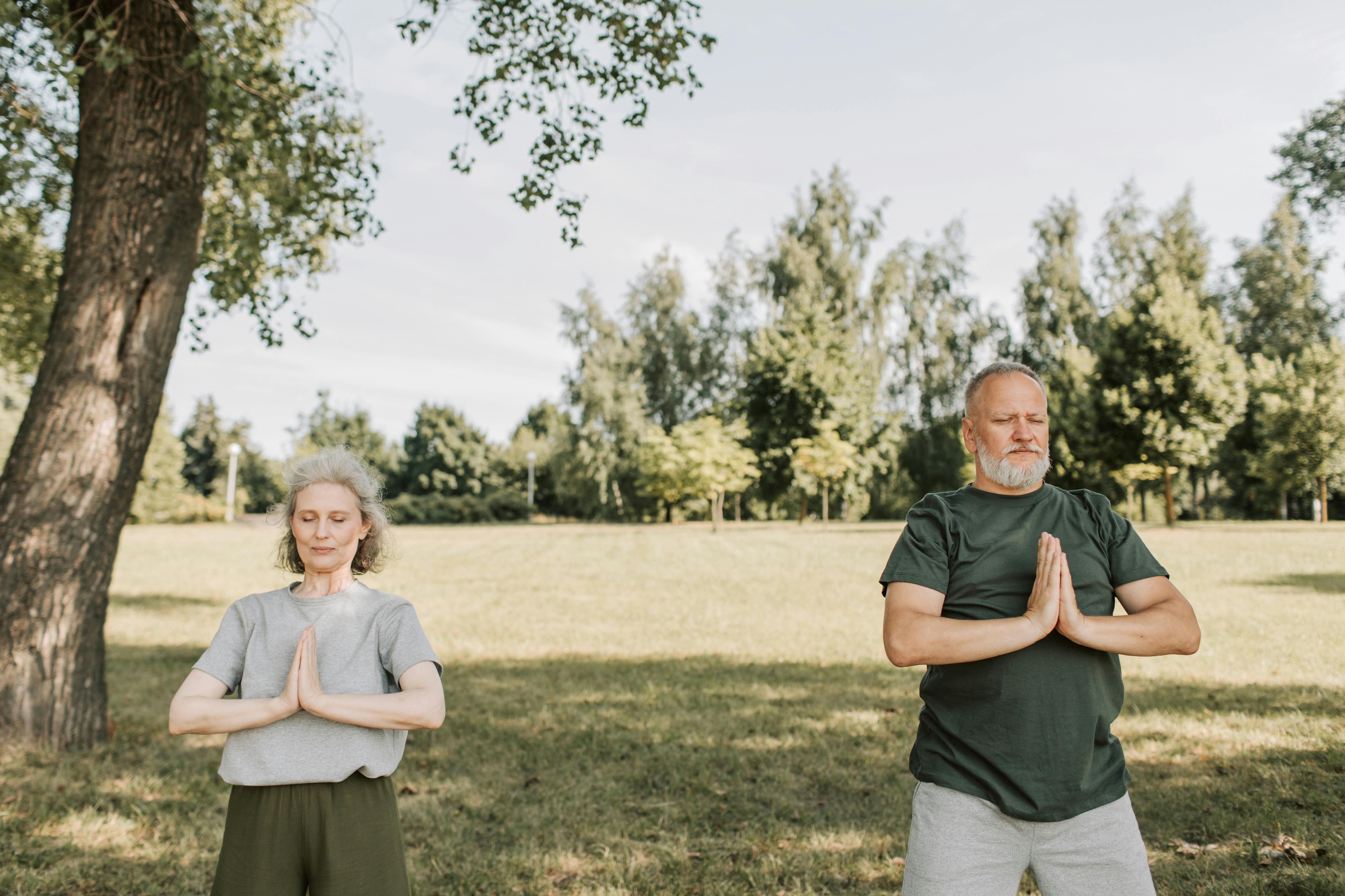 Elderly couple meditating in a calm park setting, embracing fitness and tranquility outdoors. Photo Credit: Pexels @Vlada Karpovich