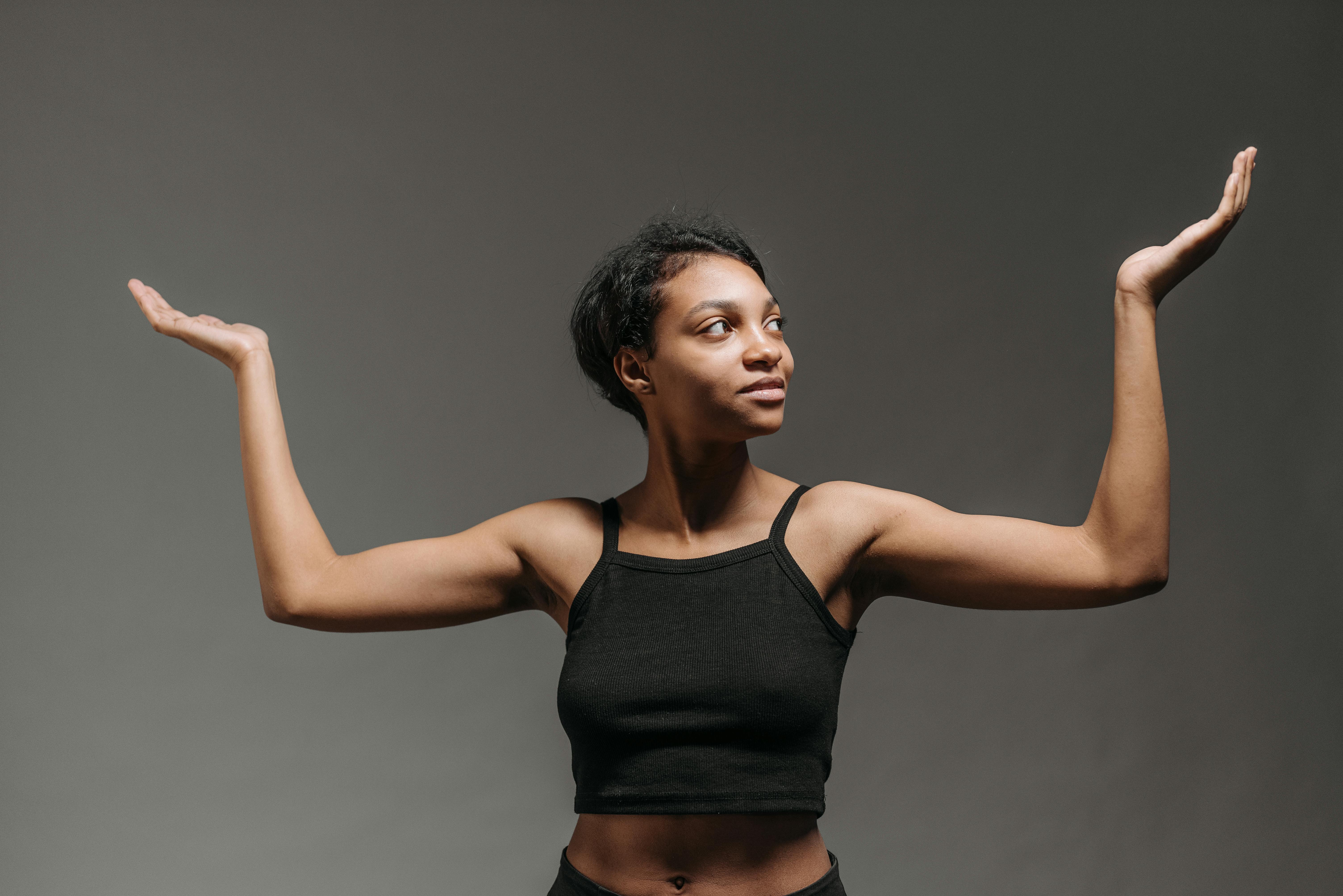 Portrait of a confident woman with raised arms in a studio setting, expressing positivity. Photo Credit: Pexels @ROCKETMANN TEAM
